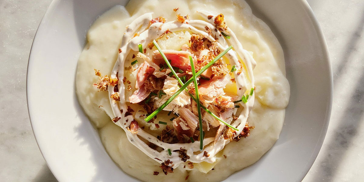 There are four components: the soup, a smoky chicken potato element for added texture, a creamy topping reminiscent of the famous white sauce, and a crispy garnish made using skin from the potatoes and chicken. You may omit any of the components or make extra of each for use in other applications. The crispy skin garnish would add nice texture to a bruschetta or dip, and the creamy topping pairs surprisingly well with bean dishes and cornbread.
