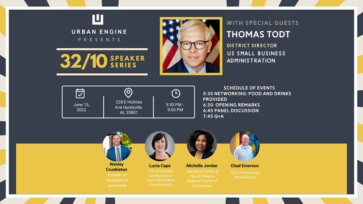 Among the panelists for the relaunch celebration are Wesley Crunkleton of Crunkleton Real Estate; Lucia Cape, senior vice president of Economic Development at the Huntsville/Madison County Chamber of Commerce; Dennis Madsen, manager of Long-Range and Urban Planning for the City of Huntsville; and Michelle Jordan, executive director of Top of Alabama Regional Council of Governments.