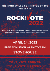 “The 2022 Rock the Vote event is an effort to drive voter registration and engagement,” says Rock the Vote Committee co-chair Caroline Kennedy. “We want North Alabama constituents to feel connected to the election process by meeting their elected officials and candidates for office. Our goal is to empower Alabama residents to learn who governs our area and how to get involved, and we do this in a fun, social atmosphere that brings people together.”