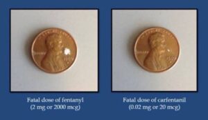 The tiny fraction of fentanyl that it would take to cause a fatal overdose would barely cover the year on a penny. A kilo of fentanyl could kill 500,000 people. One in four fentanyl pills contains a deadly dose.