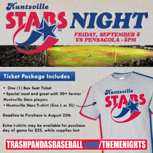 The Trash Pandas are also offering a special ticket offer for the game. Those who buy tickets can purchase a Huntsville Stars T-shirt for $20. Sizes are Large and X Large, while sizes last. The deadline is Friday. Click here to order.