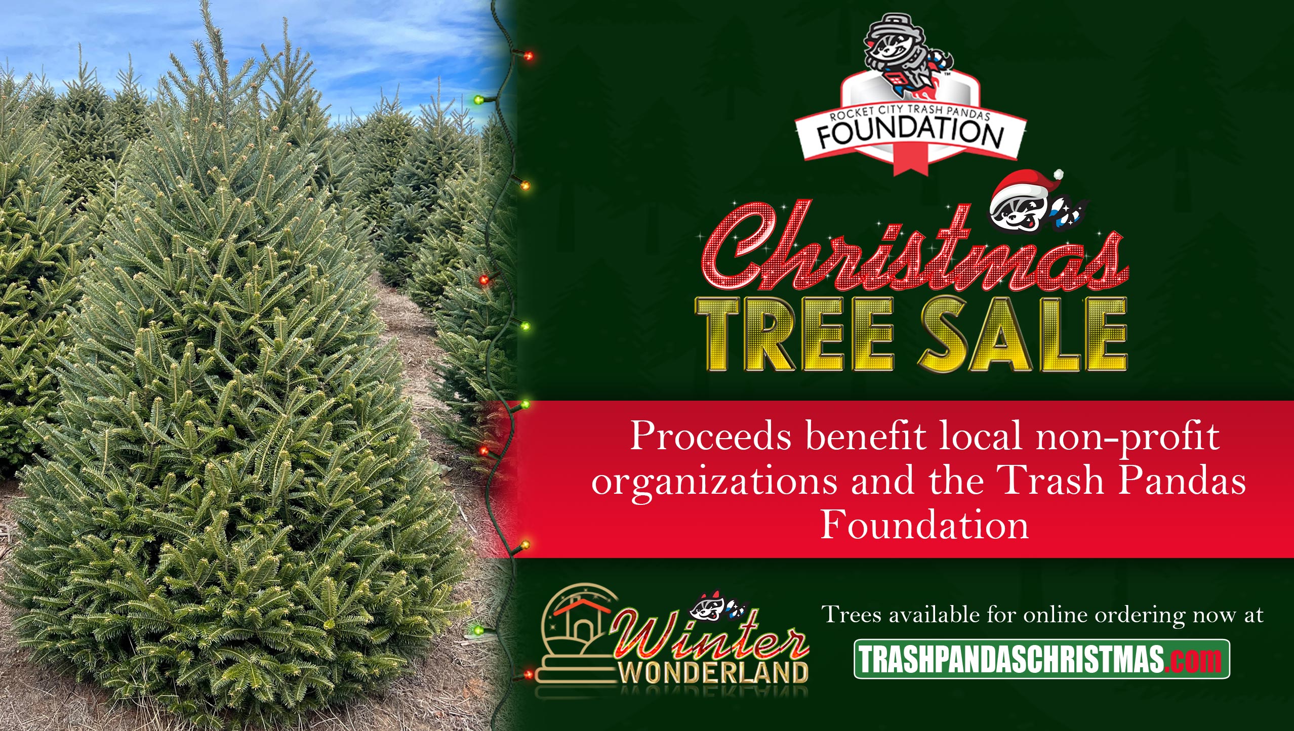 Through their Trash Pandas Foundation, the team is partnering with local nonprofit organizations, including Faith Christian Academy, First Stop, and Russell Hill Foundation of Clearview Cancer Institute, to sell Christmas trees as part of the Rocket City Christmas Light Show at Toyota Field.