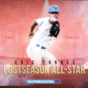 Ranked as the Angels’ number 28 prospect by MLB.com, Torres finished the first no-hitter in Trash Pandas history on Sept. 3, firing a scoreless ninth inning with three strikeouts to complete an 8-0 win over Biloxi at Toyota Field. He was originally selected by the Angels in the 14th round of the 2021 MLB draft out of Kansas State University.