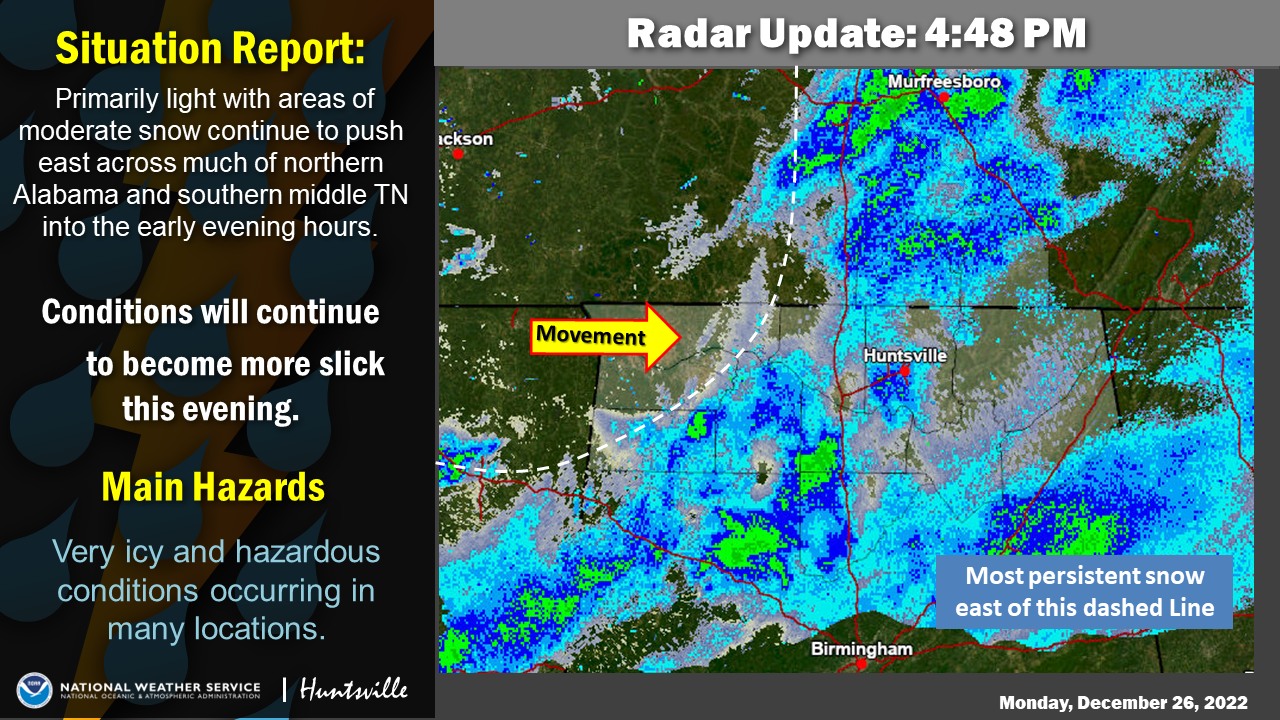 Light and moderate snow will move out of Northwest Alabama over the next few hours, the Weather Service said. The snow will affect areas through 7 p.m. and locations further east before moving out of the area