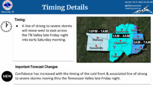 “A line of strong-severe thunderstorms is expected to track eastward across the Tennessee Valley late tonight through early Saturday morning,” the office said. “Damaging winds and tornadoes will be the greatest threats.”