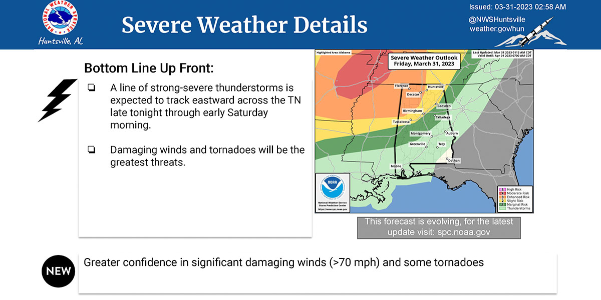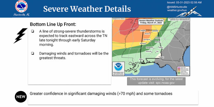 “A line of strong-severe thunderstorms is expected to track eastward across the Tennessee Valley late tonight through early Saturday morning,” the office said. “Damaging winds and tornadoes will be the greatest threats.”