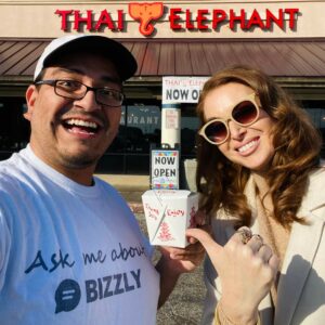 I have to admit the video looks cute. After eating an absolutely delicious meal, we head outside to take pictures in front of the restaurant. Garcia holds up his food while I point at it with my thumb.