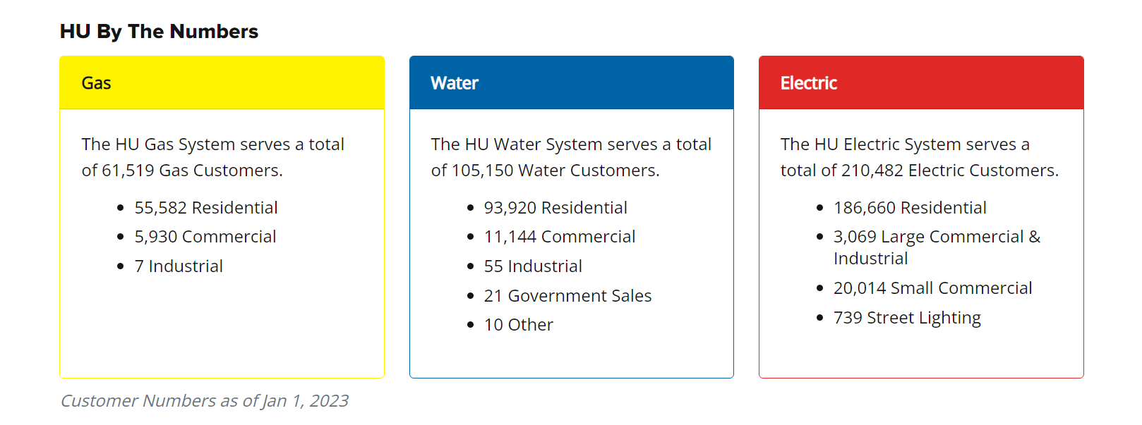 Huntsville Utilities provides service to more than 210,000 electric; 105,000 water; and 61,000 natural gas customers in Huntsville and Madison County, Alabama. Huntsville Utilities is the 17th largest publicly owned utility service in the nation.