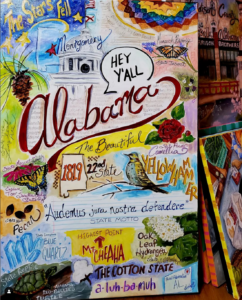 Based in Scottsboro, Clemons is prolific artist of paintings, murals and even Panoply posters. Her work focuses on the community, culture and history of Alabama. She is the resident artist for the Jackson County Drug Court providing free art classes for people in recovery.